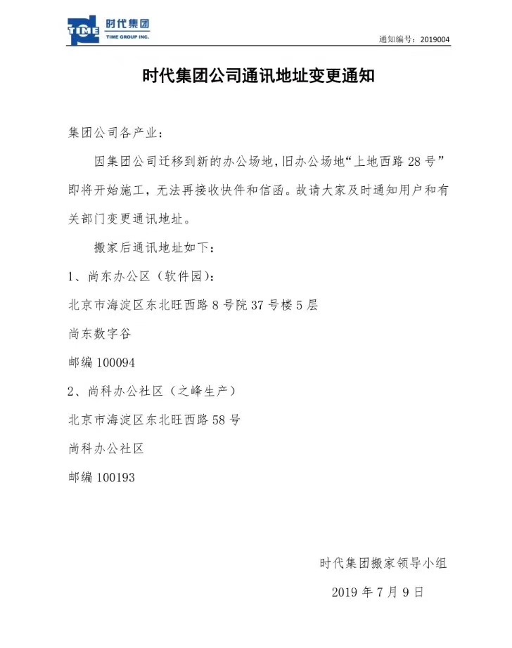 時代集團公司通訊地址變更通知