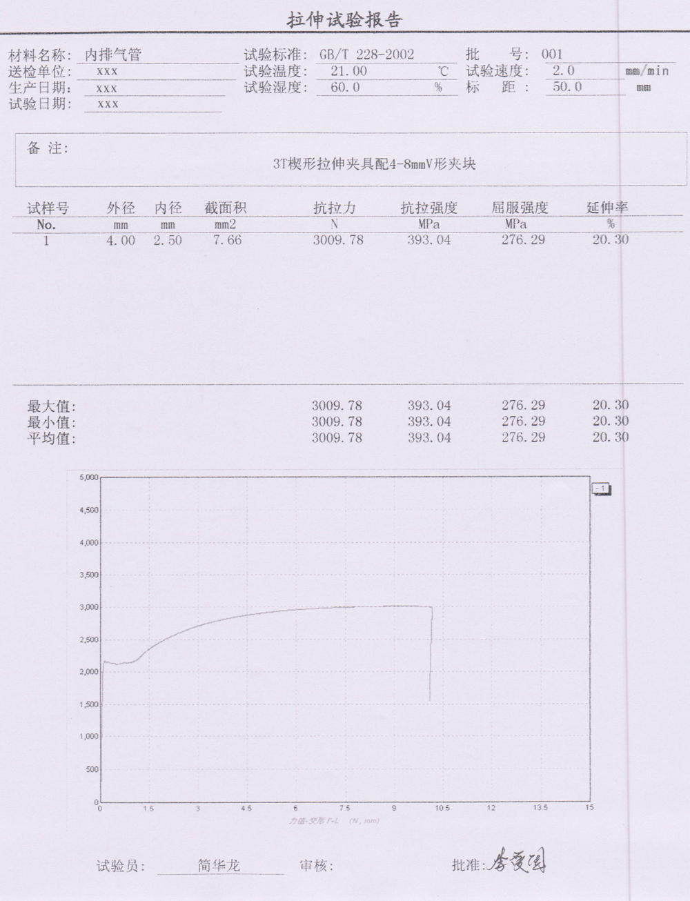 北京時代集團之峰科技有限公司用最新型的時代彈簧拉壓 試驗機 對鍍銅鋼管進行拉伸實驗。實驗材料選用長度200mm,直徑40mm,內(nèi)徑2.5mm,測量標準選用  GB/T   228-2002. 實驗速度定為2毫米每分鐘。夾具采用3T 楔形拉伸夾具。實驗步驟選用3T楔形拉伸夾具配4~8mm V形夾塊,夾持試樣上端并清零,移動橫梁到適當位置夾持試樣下端,用微動控制橫梁卸力到0~1N,并位移清零,出試驗報告。最后報告內(nèi)容是尺寸、截面移、抗拉力、抗拉強度、屈服強度、延伸率。
