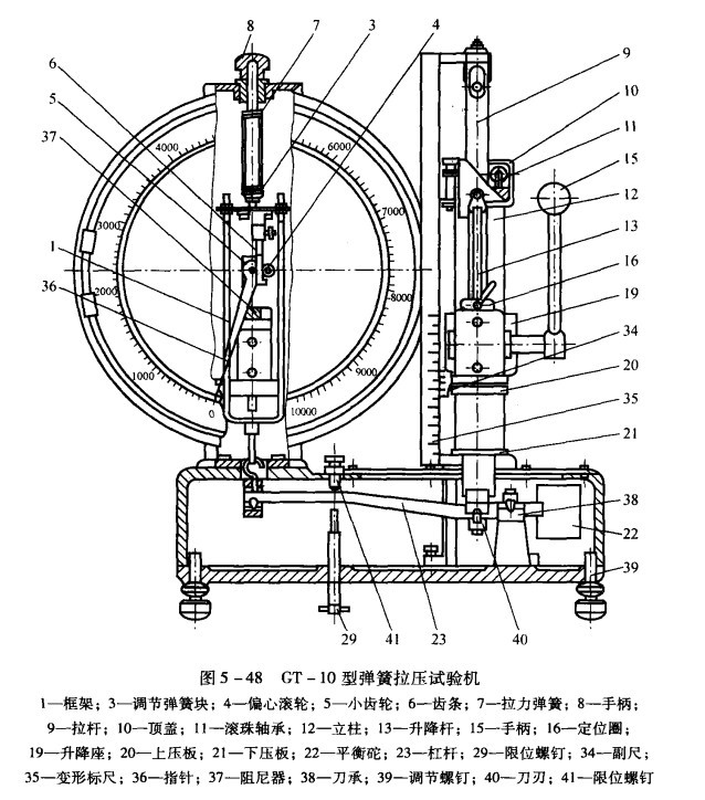 機(jī)械式彈簧拉壓試驗(yàn)機(jī)的操作程序與方法 1)轉(zhuǎn)動(dòng)手柄32使指示牌31表示出所需負(fù)荷(GT-100、200機(jī)型),調(diào)整度盤零點(diǎn),需注意調(diào)整零點(diǎn)應(yīng)加上外加夾具及試樣的重量。2)按試驗(yàn)彈簧的自由長度,搖動(dòng)手柄18使升降座19調(diào)至相應(yīng)位置,用小手柄17將其固緊在立柱12上。3)將彈簧放在下壓板21上(或掛在上拉鉤上),轉(zhuǎn)動(dòng)手柄8,使指針對準(zhǔn)度盤零點(diǎn)。4)如成批試驗(yàn)時(shí),可按彈簧在壓力或拉力下的變形量,將定位圈16固定在升降尺桿13上,若需對同一彈簧測量多點(diǎn)負(fù)荷時(shí)、可將定位桿14按不同負(fù)荷下的變形量固定好。5)將彈簧放正(或?qū)椈蓲焐希D(zhuǎn)動(dòng)手柄15加上負(fù)荷,讀取相應(yīng)的負(fù)荷或變形。6)緩慢卸除負(fù)荷