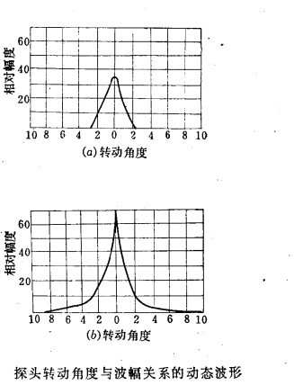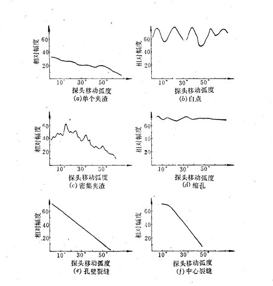 3.探頭轉動角度與波幅關系的動態(tài)波形圖 這種波形圖 用斜探頭測繪出,適用于平面工件中具有垂直或傾斜方向缺陷的定性。下圖所示為單個點缺陷和線狀缺陷的動態(tài)波形圖。從圖中看出單個而較小的點狀缺陷,探頭稍微轉動,則缺陷波立即消失。而線狀缺陷(如裂紋),其缺陷波幅隨探頭轉動角度的增大而下降直至消失。所謂轉動角度,系指發(fā)現缺陷波的最大值處為零,再將斜探頭轉動至缺陷波消失,則波束中心線與缺陷波最大值時的夾角。