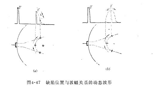 4.缺陷波位置與波幅關系的動態(tài)波形圖 這種波形圖用超聲波探傷儀直探頭測繪,適用于游動訊號缺陷的定性。下圖所示為徑向裂紋和立體形缺陷的波形圖。