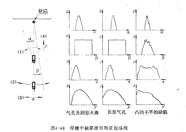 5.焊縫中缺陷的動態(tài)波形圖 焊縫中缺陷的方向和形狀,可根據探頭移動或轉動時,波形連續(xù)變化的包絡線,來判定缺陷的類型。探測焊縫時,探頭移動的方式及其所形成的包絡線,如下圖