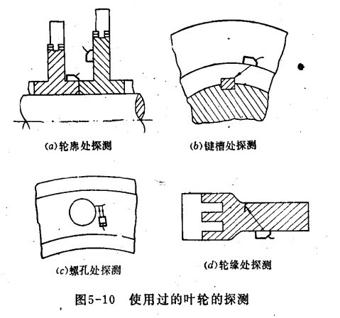 使用過的葉輪,主要是發(fā)現(xiàn)疲勞裂紋。因此探傷儀探測區(qū)域應(yīng)選擇承受應(yīng)力最大的部位,如輪殼,鍵槽,螺紋孔以及輪面與輪緣的過渡區(qū)域的截面等,如下圖示,用斜探頭在輪殼外圓上探測時,可發(fā)現(xiàn)輪殼內(nèi)的徑向缺陷和鍵槽處的缺陷。當(dāng)探頭主聲束射至鍵槽時,則出現(xiàn)強烈的鍵槽反射波,找到鍵槽反射波后,將探頭繼續(xù)向前移動,若在鍵槽反射波的附近出現(xiàn)反射波時,則鍵槽處存在裂紋。