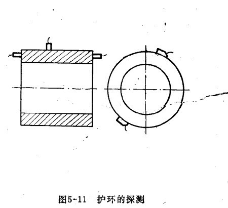 環(huán)形鍛件(如發(fā)電機(jī)護(hù)環(huán))中的缺陷具有各種方向,探測時,應(yīng)由不通過方向分別用直探頭和斜探頭進(jìn)行。用直探頭在護(hù)環(huán)的外圓表面進(jìn)行周向探測,以發(fā)現(xiàn)護(hù)環(huán)內(nèi)大部分缺陷,必要時,還應(yīng)在端面進(jìn)行探測。為發(fā)現(xiàn)裂紋,可用斜探頭(30°,40°)從護(hù)環(huán)外圓表面作周向和軸向探測,如下圖所示,使用過的護(hù)環(huán),主要用斜探頭探測其內(nèi)外表面的裂紋,對通風(fēng)孔邊緣的裂紋尚可用表面波探測。
