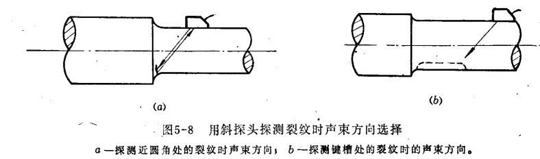 曲軸的探測 曲軸的探測以直探頭為主,一般在主軸頸、曲柄銷及扇板上進(jìn)行。必要時,可用斜探頭做輔助探測,如下圖1,用斜探頭探測近軸頸過度區(qū)圓角處或軸鍵槽處的裂紋時,應(yīng)注意選擇聲束的入射方向,如圖2。探測時還應(yīng)注意油孔反射波與缺陷波的區(qū)別。