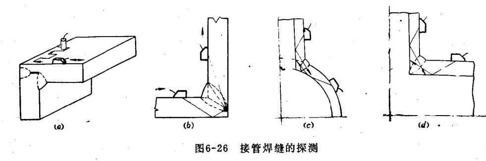 三、接管焊縫 接管焊縫的探傷方法,視工件的幾何形狀而定,一般可用橫波探測,但在條件允許下,可用縱波探測危險性缺陷,效果較好。