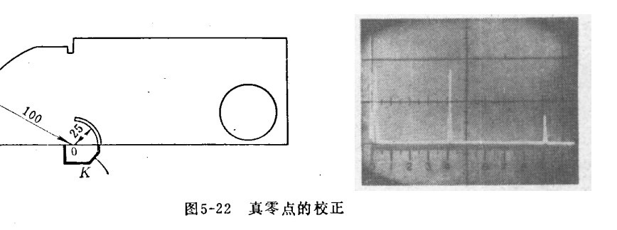 九、斜探頭真零點的校正 斜探頭聲波經(jīng)過有機玻璃延遲一段時間后,射入工件,這一段時間需在熒光屏零點刻度上予以校正。如下圖示,探頭在K處移動,直到獲得從100毫米弧度反射回的波幅最高為止,然后調(diào)整掃描線的“水平位移”及“細(xì)調(diào)”,使兩個反射波出現(xiàn)在40°及90°處為止??潭?0°的波系從100毫米處直接反射回探頭的波(路徑200毫米),而90°處的波系由100毫米處及25毫米槽處往復(fù)反射回至探頭的波(路徑450毫米)。此時,熒光屏的零點刻度即為聲波離開斜探頭有機玻璃楔塊時的零點。
