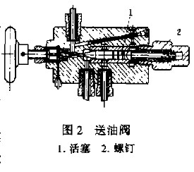 (2)送油閥內(nèi)有雜質(zhì)。當不干凈的東西如鐵沫、油渣等隨油帶到送油閥(如圖二)的內(nèi)部時,易使活塞受損,同時對指針平穩(wěn)上升亦有影響,要取出這些不清潔的東西,可擰下螺釘2用小絲桿從后面擰在活塞1上把它拉出來,用油清洗閥體內(nèi)孔、活塞,然后重新裝上活塞及螺釘2,裝螺釘2時質(zhì)疑內(nèi)部必須灌油再擰上,使內(nèi)部不存有空氣,否則會影響油閥正常使用。