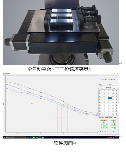 {C}11. {C}本機特別適合端淬試驗,可完全按照《鋼淬透性的末端淬火試驗方法 GB/T225-2006 》的要求,設置硬度測試的路徑后一鍵完成測試工作,配備三工位夾持臺,可實現三個端淬試樣的連續(xù)測定(夾持臺可增配至六工位) ;
