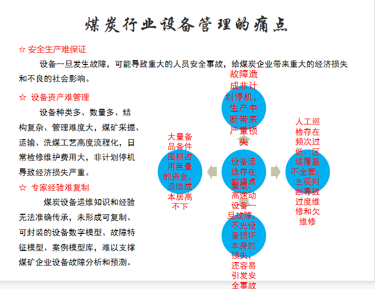 煤礦采掘、運輸、洗煤工藝高度流程化,尤其主斜井膠帶機為礦井咽喉,其傳動部件繁多(電機、減速箱、滾筒),一旦損壞將直接導(dǎo)致生產(chǎn)流程中斷。煤礦生產(chǎn)設(shè)備的逐年老化導(dǎo)致設(shè)備的維修費用也在增加。為提升煤炭企業(yè)安全生產(chǎn)水平,時代之峰將設(shè)備預(yù)測性維護解決方案全面賦能煤炭企業(yè),推進煤炭企業(yè)智能化升級,推動煤炭行業(yè)的高質(zhì)量發(fā)展。
